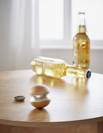 Was, in Herrgottsnamen, ist das? Und wie funktioniert es? Die erste Maßnahme, nachdem die Gäste eingetrudelt sind: Alle Anwesenden raten lassen. Umso erstaunter die Blicke, wenn BOULE mit einer lässigen Handbewegung den ersten Kronkorken von der Flasche löst. Während sich das Buchenholz angenehm in die Hand schmiegt, befreit der verspielte Flaschenöffner mit erstaunlich geringem Kraftaufwand Softdrinks und Bier vom Deckel. Ab sofort heißt es am Tisch: Roll mal rüber!